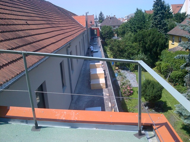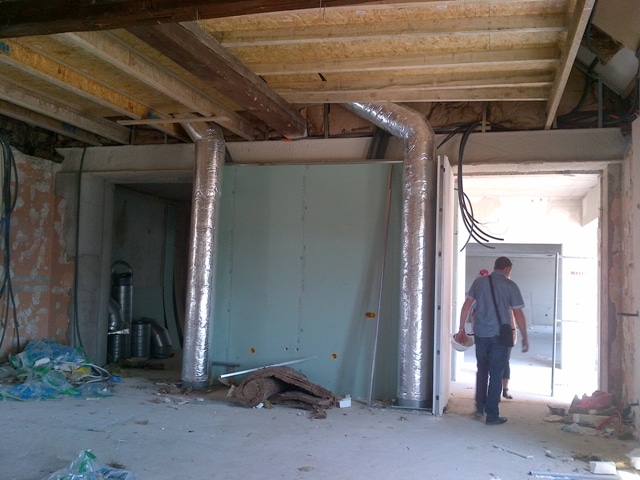 Une isolation thermique performante nécessite de contrôler la qualité de l’air intérieur. D’autant qu’il s’agit d’une école maternelle ! L’architecte a ainsi souhaité anticiper les futures réglementations concernant le renouvellement d’air des locaux recevant du public. 11 centrales de traitement d’air sont ainsi en cours d’installation. L’hiver, ces centrales à double flux évitent les trop fortes déperditions thermiques liées au renouvellement d’air. En pratique, un échangeur de chaleur à haut rendement permet à l’air entrant de récupérer au moins 80 % de la chaleur contenue dans l’air sortant. « Autre avantage de ces centrales : les filtres qui les équipent permettent d’éviter l’entrée de pollens et autres allergènes dans l’air intérieur », précise Gwenaelle Cavard, en charge des études fluides et thermiques sur le projet.